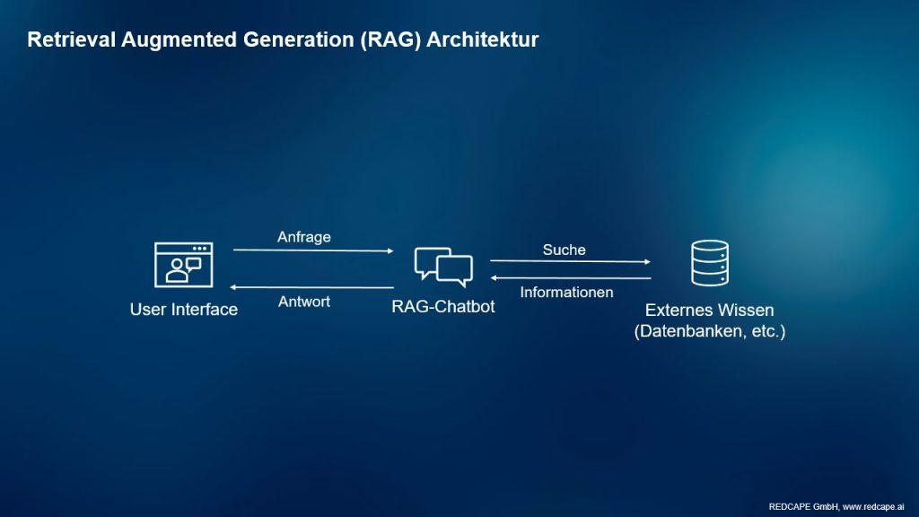 Wie kann ein LLM unternehmensinternes Wissen nutzen, ohne darauf trainiert werden zu müssen? Die Antwort ist eine Retrieval Augmented Generation (kurz RAG) Architektur. Statt direkt die Antwort auf eine Anfrage von einem LLM generieren zu lassen, wird in dieser Architektur zunächst eine Wissensdatenbank nach relevanten Informationen durchsucht und die gefundenen Ergebnisse als Kontext zur Beantwortung der Anfrage vom LLM verwendet. So können auch ohne aufwendiges Training stets aktuelle Informationen berücksichtigt werden und die Quellen können in den Antworten mit angegeben werden.